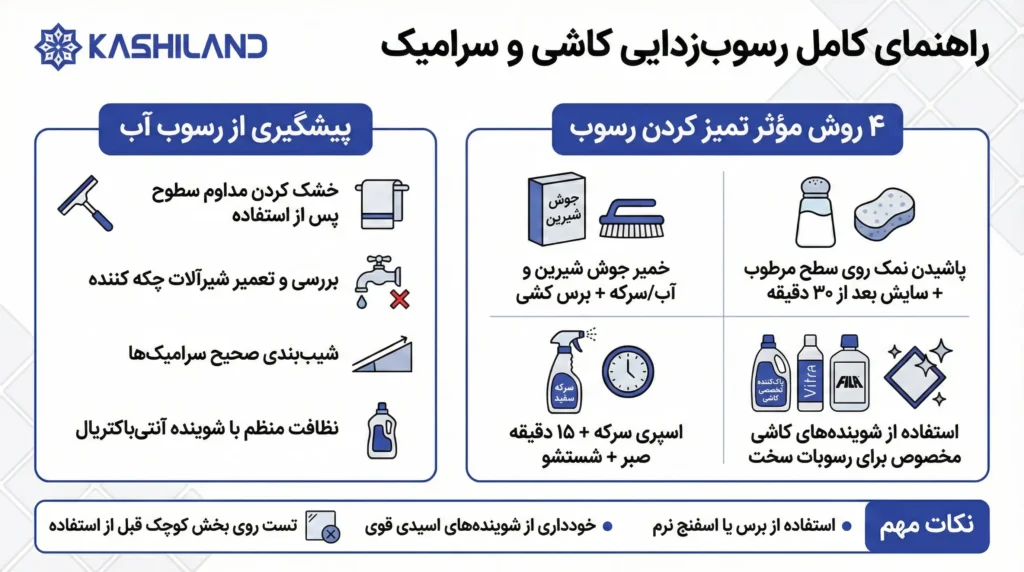 | سرکه سفید | اسپری روی سطح و ماندگاری ۱۵ دقیقه، سپس شستشو؛ مؤثر بر رسوب سبک و طبیعی. |